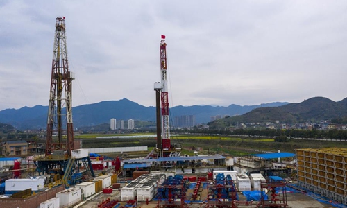 Aerial photo taken on Feb. 22, 2020 shows a shale gas platform of China Petrochemical Corporation in southwest China's Chongqing Municipality. A total of 14 operation points of the shale gas platform have resumed production, boosting the daily shale gas output from 2.11 million cubic meters to 2.53 million cubic meters that secured the downstream companies' operation needs amid the fight against the novel coronavirus outbreak. (Xinhua/Liu Chan)