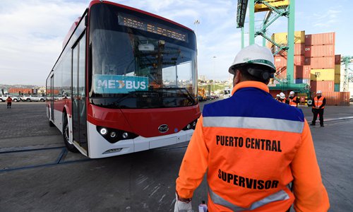 An electric bus, manufactured by Chinese company BYD, arrives in the port of San Antonio, in the region of Valparaiso, Chile, July 31, 2019. (Xinhua/Jorge Villegas)