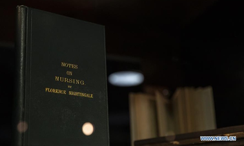 Photo taken on Feb. 24, 2020 shows Notes on Nursing written by Florence Nightingale at Florence Nightingale Museum in London, Britain. 2020 sees the 200th birth anniversary of Florence Nightingale. (Xinhua/Han Yan)