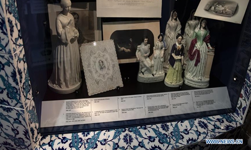 Photo taken on Feb. 24, 2020 shows statues and paintings about Florence Nightingale on display at Florence Nightingale Museum in London, Britain. 2020 sees the 200th birth anniversary of Florence Nightingale. (Xinhua/Han Yan)
