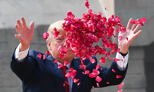 US President Donald Trump tosses rose petals at Raj Ghat, the memorial for Indian independence icon Mahatma Gandhi, in New Delhi on Tuesday.Trump concluded a two-day visit to India on Tuesday. Photo: AFP