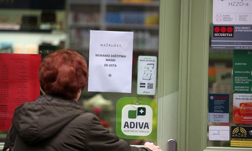 A woman looks at a notice which reads "We have no protective masks" at a pharmacy in Rijeka, Croatia, Feb. 25, 2020. Croatian Prime Minister Andrej Plenkovic announced here on Tuesday that Croatia has confirmed the first case of COVID-19 infection. (Goran Kovacic/Pixsell via Xinhua)