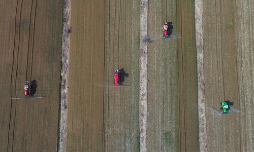 Aerial photo taken on Feb. 26, 2020 shows a farmer driving a self-propelled sprayer on a farm in Xintun Village of Tancheng County in Linyi City, east China's Shandong Province. Spring ploughing is underway in many areas of China amid the fight against the novel coronavirus disease (COVID-19). (Photo by Zhang Chunlei/Xinhua)