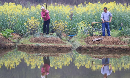 Villagers plough a field in Chishui Village, Hengyang County of central China's Hunan Province, Feb. 26, 2020. Spring ploughing is underway in many areas of China amid the fight against the novel coronavirus disease (COVID-19). (Photo by Cao Zhengping/Xinhua)