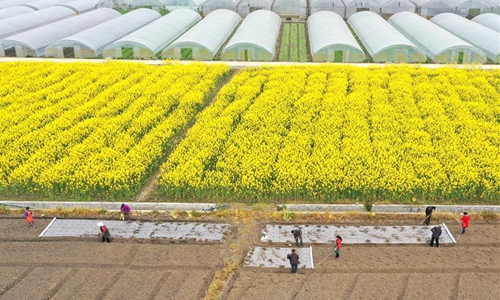 Aerial photo taken on Feb. 26, 2020 shows farmers laying plastic mulch on a vegetable field in Guitou Village of Daoxian County in Yongzhou, central China's Hunan Province. Spring ploughing is underway in many areas of China amid the fight against the novel coronavirus disease (COVID-19). (Photo by He Hongfu/Xinhua)