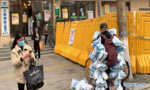 A community service worker carries medicines for residents in Jiang'an District of Wuhan, capital of central China's Hubei Province, Feb. 24, 2020. Feng helped residents in Huiminyuan community to buy medicines for chronic diseases on Monday. He found a fresh way to hang the medicines on his body as there were too much bags to carry. (Xinhua)