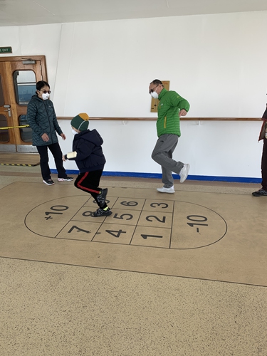 Passengers wearing masks play outside on the Diamond Princess during quarantine. Photo: Courtesy of Yardley Wong