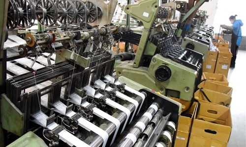 A staff member works in a factory producing face mask earloop in Qingdao, east China's Shandong Province, March 5, 2020. The factory has resumed production of face mask earloop to aid the fight against the novel coronavirus. Photo:Xinhua