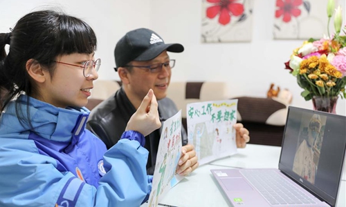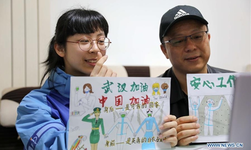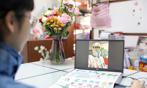 Zhang Qu's daughter send her blessing for International Women's Day via a video call at home in Hefei, east China's Anhui Province, March 7, 2020. Zhang Qu is a member of the seventh batch of medical team of Anhui to aid Hubei amid the outbreak of the novel coronavirus disease (COVID-19). (Xinhua/Cao Li)