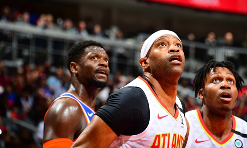 Vince Carter (center) of the Atlanta Hawks looks on in the game against the New York Knicks on Wednesday in Atlanta, Georgia. Photo: VCG