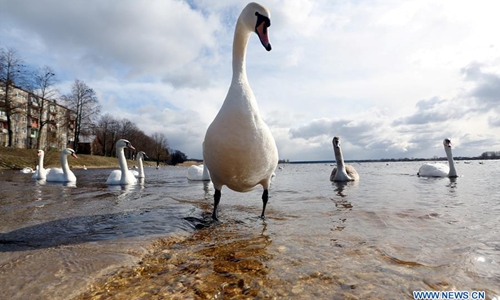 Swans are seen in river Daugava in Riga, Latvia, March 14, 2020. (Photo by Edijs Palens/Xinhua)