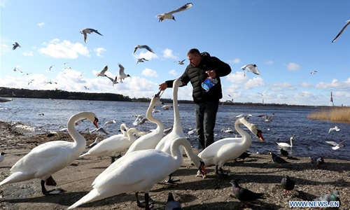 A man feeds swans in Riga, Latvia, March 14, 2020. (Photo by Edijs Palens/Xinhua)