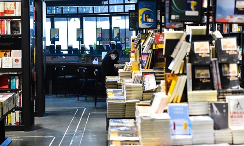 A woman reads in a bookshop in Taiyuan, north China's Shanxi Province, March 20, 2020. Life and production have gradually resumed here in Taiyuan under strict measures to prevent and control the novel coronavirus epidemic.Photo:Xinhua