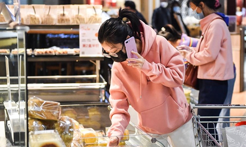 Customers shop in a supermarket in Taiyuan, north China's Shanxi Province, March 20, 2020. Life and production have gradually resumed here in Taiyuan under strict measures to prevent and control the novel coronavirus epidemic. Photo:Xinhua