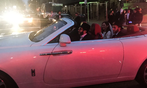 Groom JJ Deitch and wife, Fraida, ride in the pack of a convertible as people gather for their wedding in Brooklyn, New York on Thursday. Photo: AFP