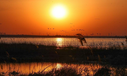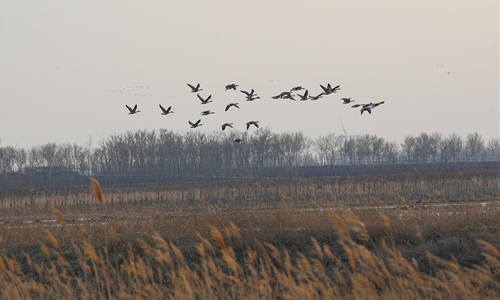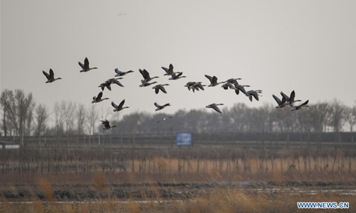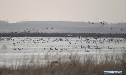 Photo taken on March 31, 2020 shows migrant birds at the Wolong Lake wetland in Kangping County of Shenyang, capital of northeast China's Liaoning Province. (Xinhua/Long Lei)