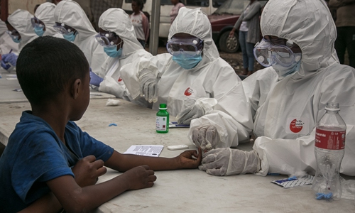 Health workers in Antananarivo, Madagascar collect blood samples from a child to test for COVID-19 on April 3. Photo: AFP