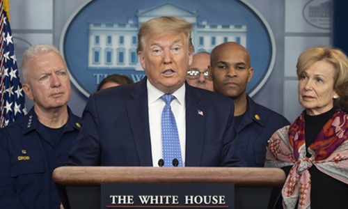 US President Donald Trump standing with members of the White House Coronavirus Task Force team, speaks during a press briefing in the press briefing room of the White House on March 14 in Washington, DC. Photo: AFP