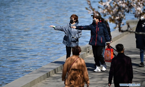 People walk by Haihe River in Tianjin, north China, March 27, 2020. (Xinhua/Li Ran)