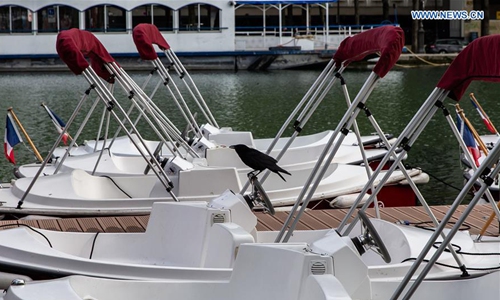 A crow is seen on a pleasure boat in Paris, France, on April 12, 2020. As of Sunday, the number of people who have died from the COVID-19 in France totaled 14,393, representing a one-day increase of 561, down from Saturday's 643, while serious cases decreased for the fourth straight day. (Photo by Aurelien Morissard/Xinhua)