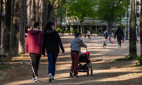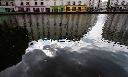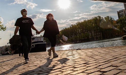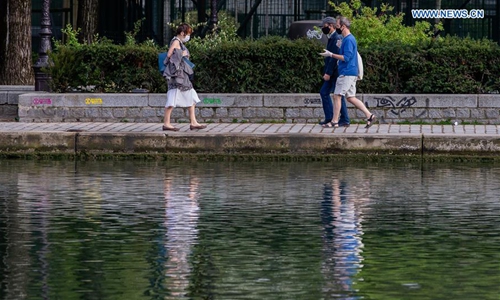 People wearing face masks walk along the Bassin de la Villette in Paris, France, on April 12, 2020. As of Sunday, the number of people who have died from the COVID-19 in France totaled 14,393, representing a one-day increase of 561, down from Saturday's 643, while serious cases decreased for the fourth straight day. (Photo by Aurelien Morissard/Xinhua)