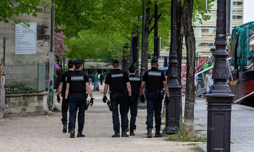 National Gendarmerie officers patrol along the Bassin de la Villette in Paris, France, on April 12, 2020. As of Sunday, the number of people who have died from the COVID-19 in France totaled 14,393, representing a one-day increase of 561, down from Saturday's 643, while serious cases decreased for the fourth straight day. (Photo by Aurelien Morissard/Xinhua)