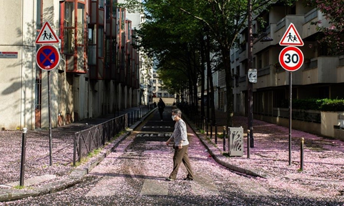 A woman wearing a face mask walks across a street in Paris, France, on April 12, 2020. As of Sunday, the number of people who have died from the COVID-19 in France totaled 14,393, representing a one-day increase of 561, down from Saturday's 643, while serious cases decreased for the fourth straight day. (Photo by Aurelien Morissard/Xinhua)