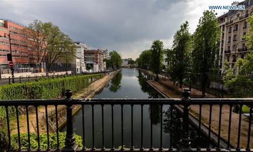 Few people are seen along the Quay of Jemmapes in Paris, France, on April 12, 2020. As of Sunday, the number of people who have died from the COVID-19 in France totaled 14,393, representing a one-day increase of 561, down from Saturday's 643, while serious cases decreased for the fourth straight day. (Photo by Aurelien Morissard/Xinhua)