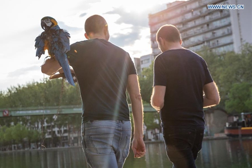 A man with a parrot walks on a street in Paris, France, on April 12, 2020. As of Sunday, the number of people who have died from the COVID-19 in France totaled 14,393, representing a one-day increase of 561, down from Saturday's 643, while serious cases decreased for the fourth straight day. (Photo by Aurelien Morissard/Xinhua)