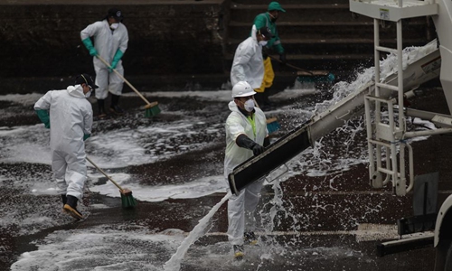 Members of staff disinfect a farm product market amid coronavirus pandemic in Bogota, Colombia, April 10, 2020. (Photo by Jhon Paz/Xinhua)