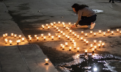 Worshippers light candles outside the closed Syriac Orthodox Church of the Virgin Mary as they mark Palm Sunday amid the coronavirus pandemic in the northeastern Syrian Kurdish-controlled city of Qamishli on Sunday. Photo: AFP