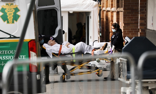 Medical workers take in patients at a special coronavirus intake area at Maimonides Medical Center on April 07 in the Borough Park neighborhood of the Brooklyn borough of New York City. Photo: AFP