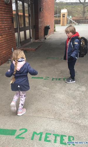 Children are greeted with strict social distancing requirements at Stengaard School in Gladsaxe Kommune of Copenhagen region as daycares, kindergartens and elementary school of 0-5 grades reopened, in Copenhagen, Denmark, April 15, 2020. (Photo by David A.Williams/Xinhua)