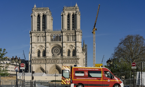 A Paris Fire Department truck in front of the Notre-Dame Cathedral in Paris on April 4 Photo: AFP