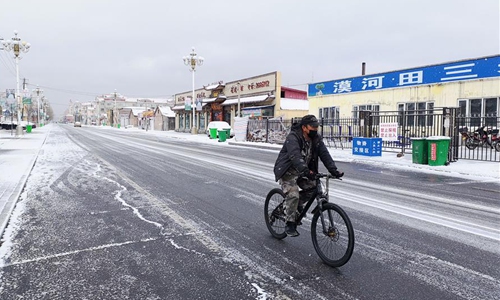 A man rides a bicycle against snowfall in Mohe City, northeast China's Heilongjiang Province, April 19, 2020. A snowfall swept Mohe, China's northernmost city, on Sunday. Photo:Xinhua