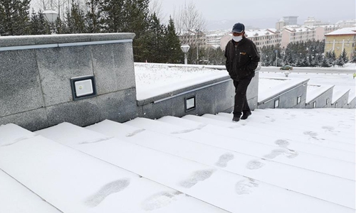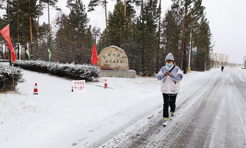 A man walks against snowfall in Mohe City, northeast China's Heilongjiang Province, April 19, 2020. A snowfall swept Mohe, China's northernmost city, on Sunday. Photo:Xinhua
