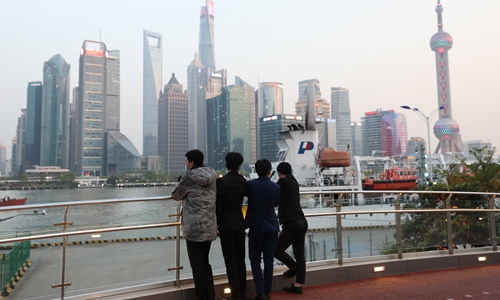Visitors on the Bund in Shanghai look at the skyline in Pudong New Area across the Huangpu River on Thursday. Pudong will celebrate its 30-year anniversary of opening-up and development on Saturday. Photo: Yang Hui/GT