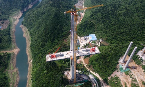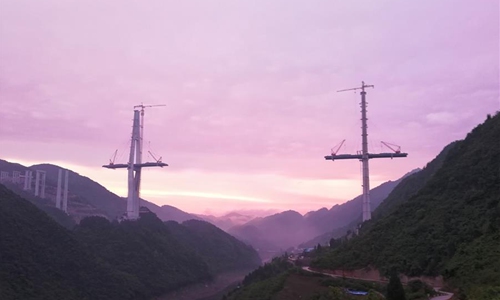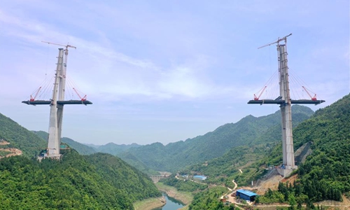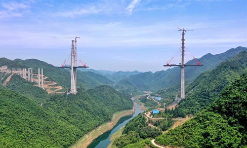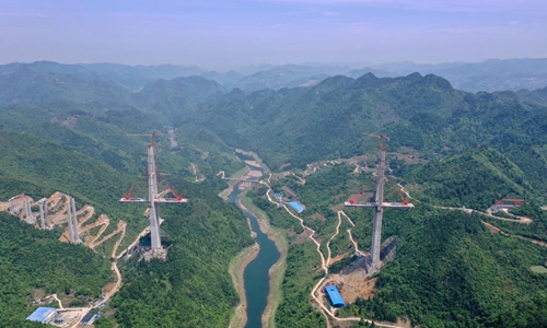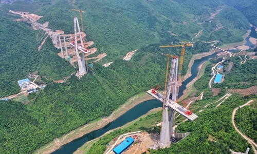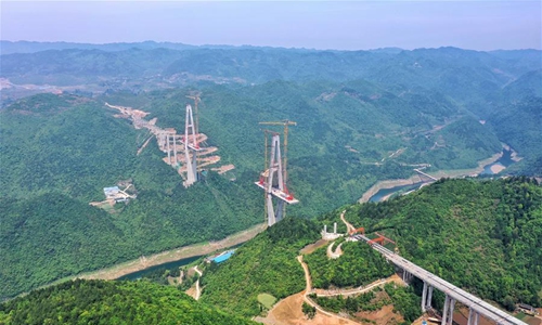 Aerial photo taken on April 26, 2020 shows the construction site of the Xiangjiang bridge in southwest China's Guizhou Province. With strict COVID-19 prevention and control measures in place, construction work of the 1,700-meter bridge has been resumed recently. (Xinhua/Liu Xu)