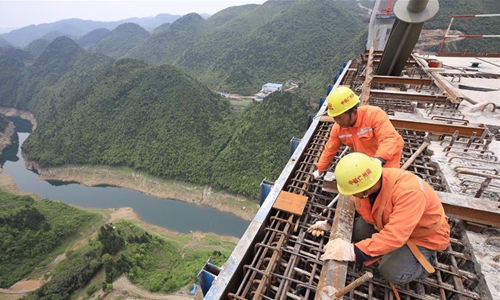 People work at the construction site of the Xiangjiang bridge in southwest China's Guizhou Province, April 26, 2020. With strict COVID-19 prevention and control measures in place, construction work of the 1,700-meter bridge has been resumed recently. (Xinhua/Liu Xu)