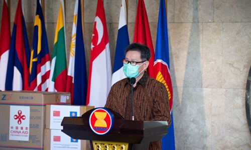 Secretary-General of the Association of Southeast Asian Nations (ASEAN) Lim Jock Hoi speaks during a handover ceremony of medical supplies donated by China at the ASEAN Secretariat Building in Jakarta, Indonesia, April 21, 2020. (Xinhua/Du Yu)