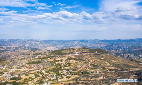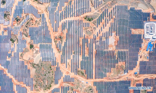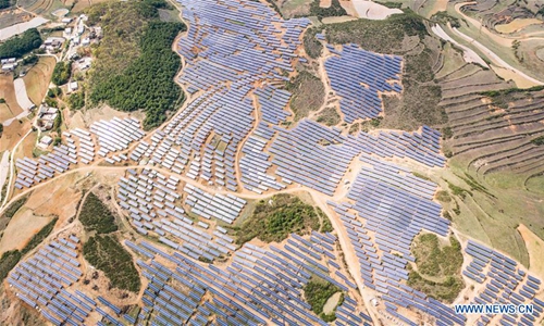 Aerial photo taken on April 26, 2020 shows photovoltaic panels at a photovoltaic power station in Weining County, southwest China's Guizhou Province. (Xinhua/Tao Liang)