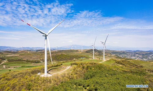 Aerial photo taken on April 27, 2020 shows wind power installations in Weining County, southwest China's Guizhou Province. (Xinhua/Tao Liang)