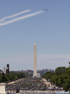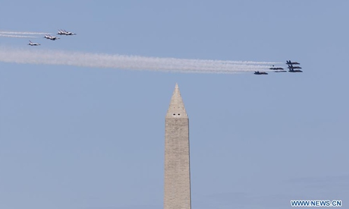 A formation of the Thunderbirds and Blue Angels fly over the National Mall in Washington D.C., the United States, on May 2, 2020. The U.S. Navy's Blue Angels and U.S. Air Force's Thunderbirds honored frontline COVID-19 responders and essential workers with formation flights over here on Saturday. (Photo by Ting Shen/Xinhua)