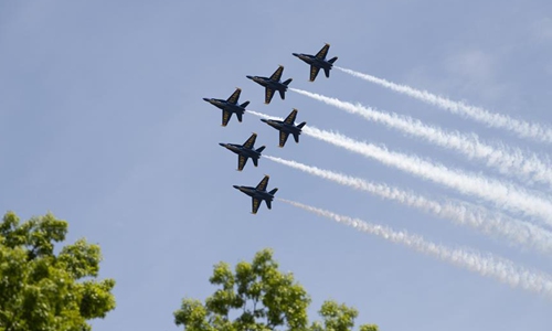 A formation of the Blue Angels fly over Washington D.C. area, the United States, on May 2, 2020. The U.S. Navy's Blue Angels and U.S. Air Force's Thunderbirds honored frontline COVID-19 responders and essential workers with formation flights over here on Saturday. (Xinhua/Liu Jie)