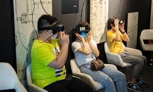 Visitors try VR glasses to view the artwork during an art exhibition titled "Tribute to Da Vinci" at the Changsha IFS in Changsha, central China's Hunan Province, May 4, 2020. (Xinhua/Chen Sihan)