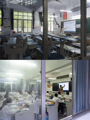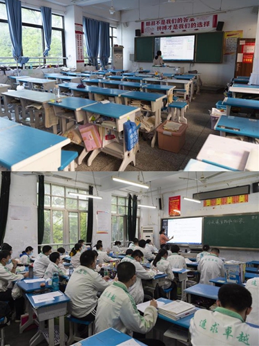 Combo photo shows a teacher from No. 4 High School of Xiangyang giving an on-line class to students via a multi-media system in Xiangyang City, central China's Hubei Province, April 14, 2020 (top) and senior students at No. 4 High School of Xiangyang taking a face-to-face class on May 7, 2020. Graduating high and vocational school students in Hubei Province returned to schools on Wednesday. (Xinhua/Xie Jianfei)