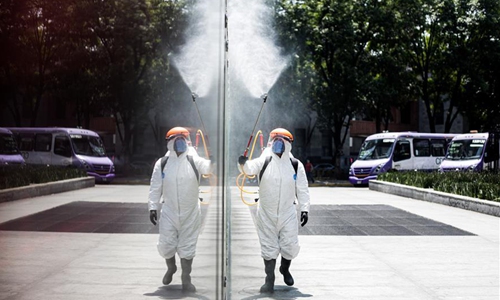 A worker disinfects handrails on a street in Mexico City, Mexico, April 6. Photo: Xinhua