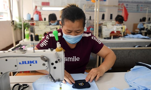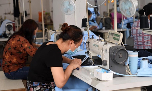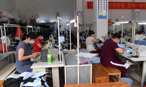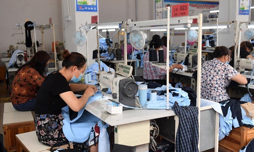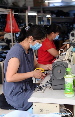 People work at a poverty alleviation workshop at a relocation settlement in Huanjiang Maonan Autonomous County, south China's Guangxi Zhuang Autonomous Region, May 14, 2020. There are a total of 16 poverty alleviation workshops at the relocation settlements in the county seat, which provided over 2,000 job posts to relocated residents. (Xinhua/Lu Boan)
