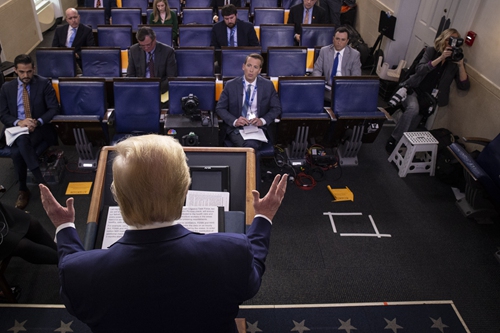 US President Donald Trump answers questions from the media during the daily briefing on the novel coronavirus, COVID-19, in the Brady Briefing Room of the White House in Washington, DC on April 21. Photo: AFP