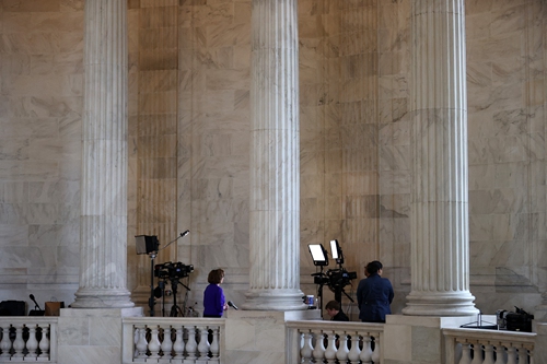US Speaker of the House Nancy Pelosi is interviewed by CNN about the government response to the ongoing global coronavirus pandemic in the rotunda of the Russell Senate Office Building on Capitol Hill on April 1 in Washington, DC. Photo: AFP